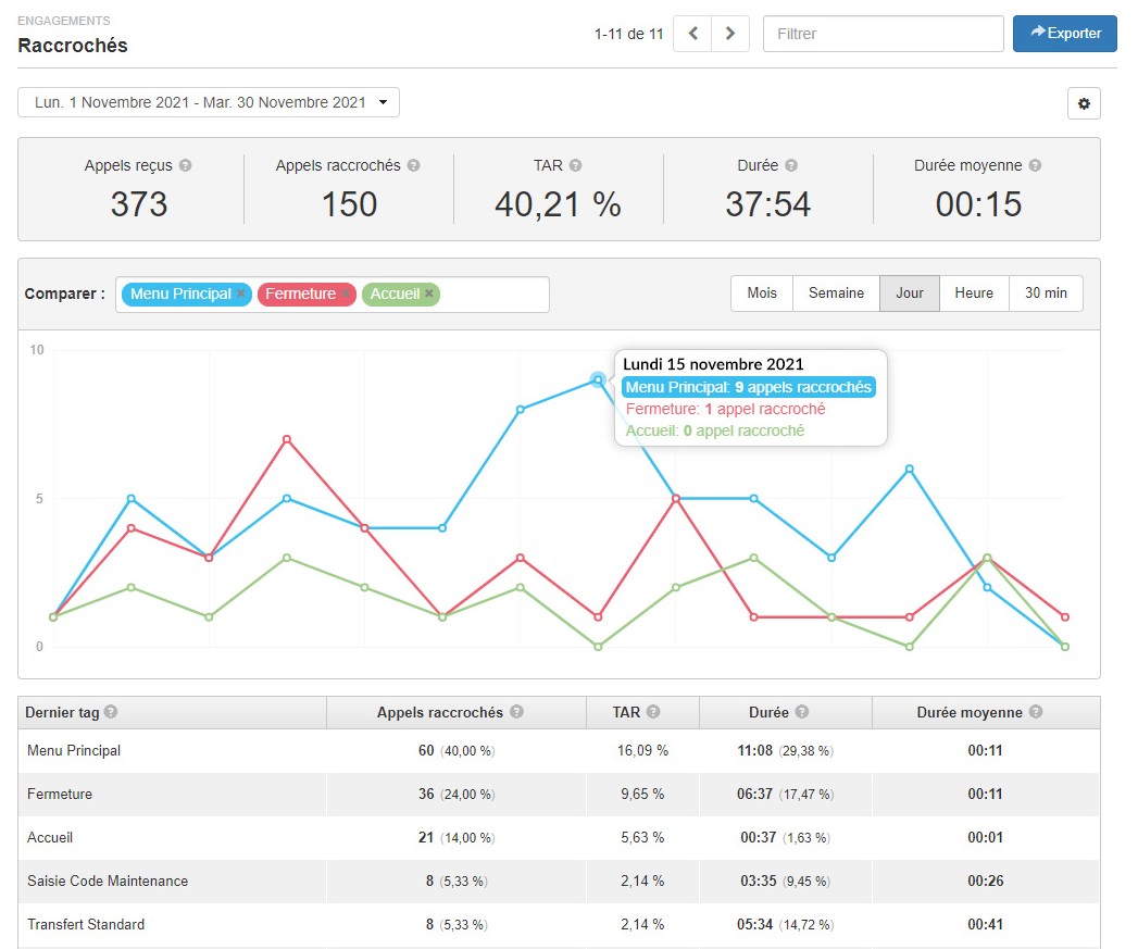 Le rapport Raccrochés permet également de comparer les données en fonction des différents tags configurés dans l’application vocale. Le graphique permet de comprendre la répartition des appels raccrochés, pour 3 tags, sur la période de temps renseignée.