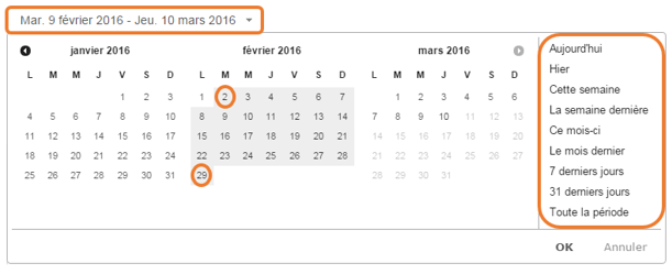 - Cliquer sur une des périodes prédéfinies : « Aujourd’hui », « Hier », « Le mois dernier », … La période souhaitée est affichée.